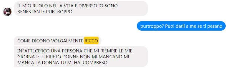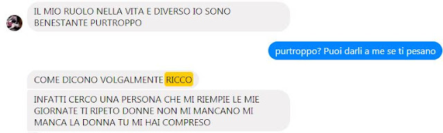 In chat poi sembra tutt'altro che cardiopatico, non rifiuta chat erotiche, da vero gentleman chiede anche scatti piccanti, SCHIFOSAMENTE RICCO, possiede una villa, conosce personaggi importanti, cerca su facebook l'amore della sua vita. Con tutti questi requisiti non dovrebbe essere difficile trovare una donna, non servirebbero nemmeno tanti profili.