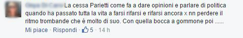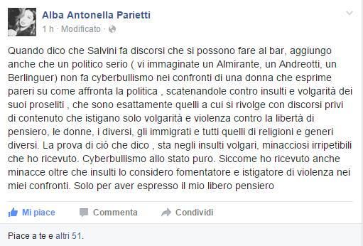 L'onorevole Salvini inoltre non si preoccupa minimamente di moderare i commenti, o almeno chiedere ai propri fan di usare un linguaggio meno volgare. Anzi caso strano, salvini che pubblica in media un post ogni 60 minuti, questa volta lascia in cima alla sua pagina come ultimo post quello di parietti per ben 14 ore. Un vero record.