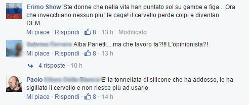 Ci risiamo dopo Dario Fò ora tocca ad Alba Parietti. Chiunque abbia un idea diversa da Salvini viene messo alla gogna sulla sua pagina. Sembra quasi che l'onorevole salvini usi i suoi fan come scudo, per attaccare chiunque metta in discussione la sua parola.