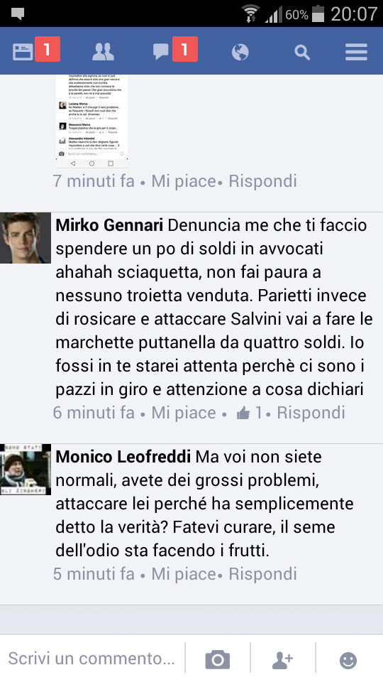 Allora Salvini accetti o no questa sfida ? Su temi seri e politici non su insulti da cyberbullista? Visto che mi vuoi sfidare usando il tuo peggio come già fai nei discorsi populistici, io sono a tua disposizione. Sempre che tu abbia il coraggio e gli argomenti. Che spero non siano come quelli di alcuni tuoi " seguaci , che argomentano i loro pareri, sparando volgari e stupidi insulti, parlando del mio culo, della mia età , della mia bocca. Cioè esattamente l'elettorato a cui tu ti rivolgi. Sono discorsi e insulti da bar. La politica seria ( che io non rappresento e non sono , tu la dovresti rappresentare) non è' questa . Ritorno a dire " discorsi da bar sport". Ti immagini un Berlinguer, un Andreotti , un Almirante rispondere a temi seri ( corruzione, migrazione, traffico di droga, armi, disoccupazione) con insulti a una soubrette su fb , con insulti dei propri seguaci e frasette da piccato cyberbullista? Io sono a tua disposizione per un dialogo , non per cazzate populistiche , demagogiche. Antropologicamente da ignorante e intellettualmente disoneste.